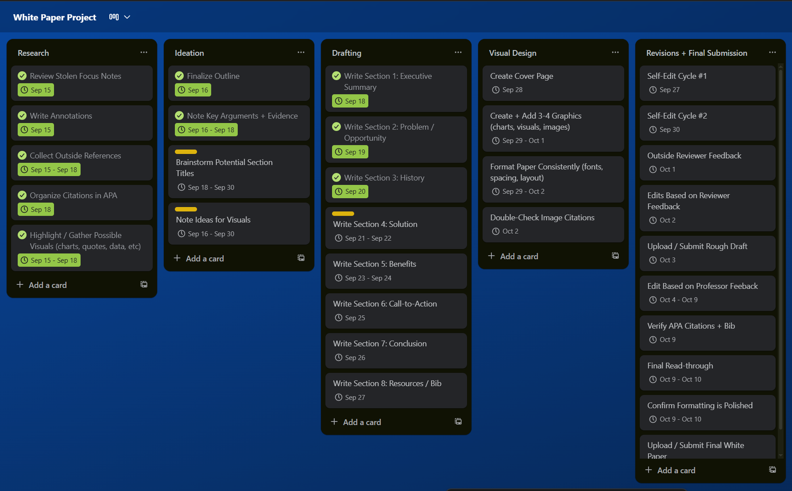 For my white paper project, I set up a Trello board to keep everything organized. I broke the project down into stages: research, ideation, drafting, visual design, and revisions + final submission. Within each stage, I created checklists and deadlines. Having it all laid out visually gave me two things: (1) a clear roadmap so I wasn’t just staring into the void of “do project,” and (2) accountability, because those little digital cards serve as reminders that I either hit a deliverable… or I don’t.
