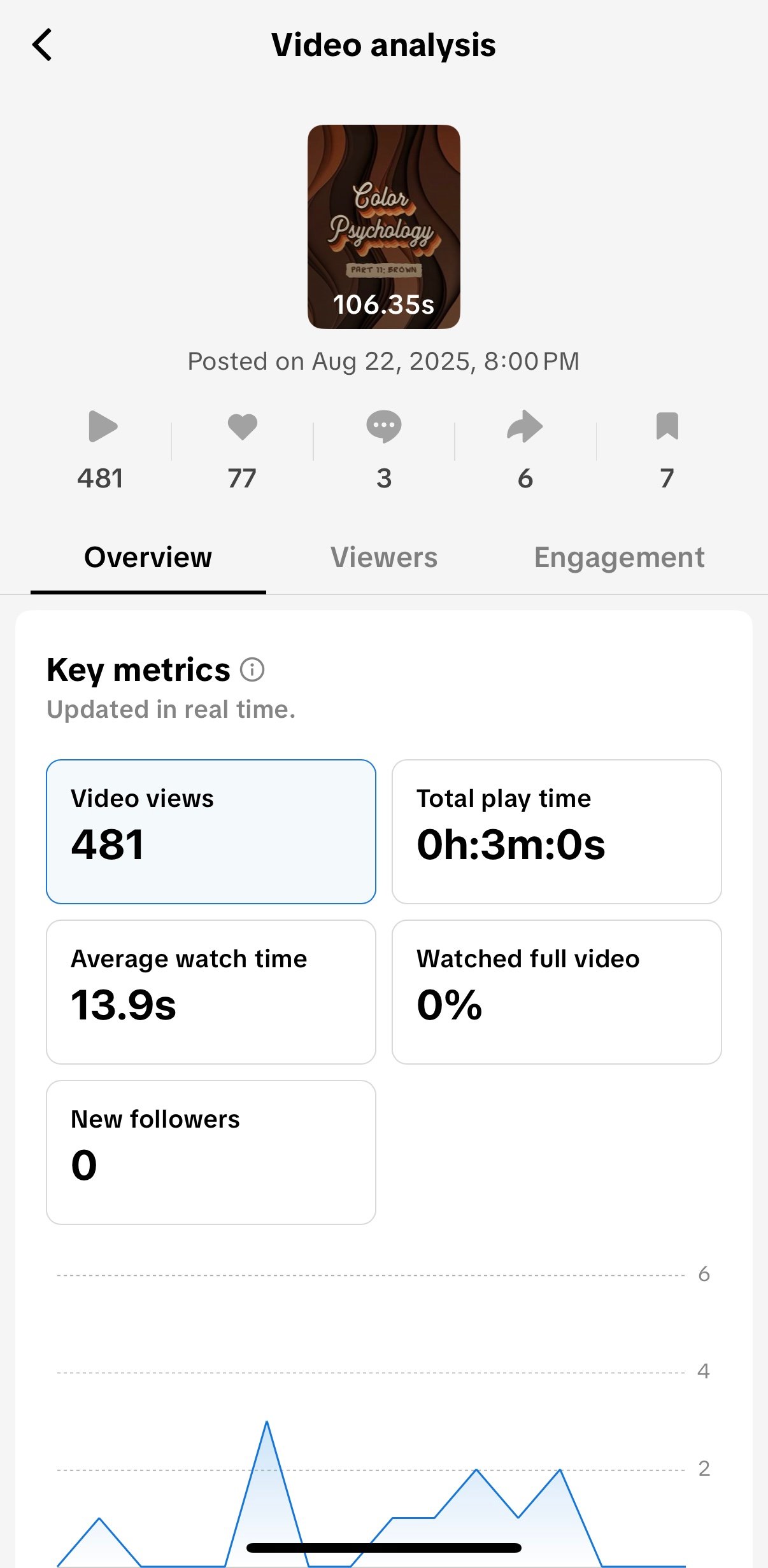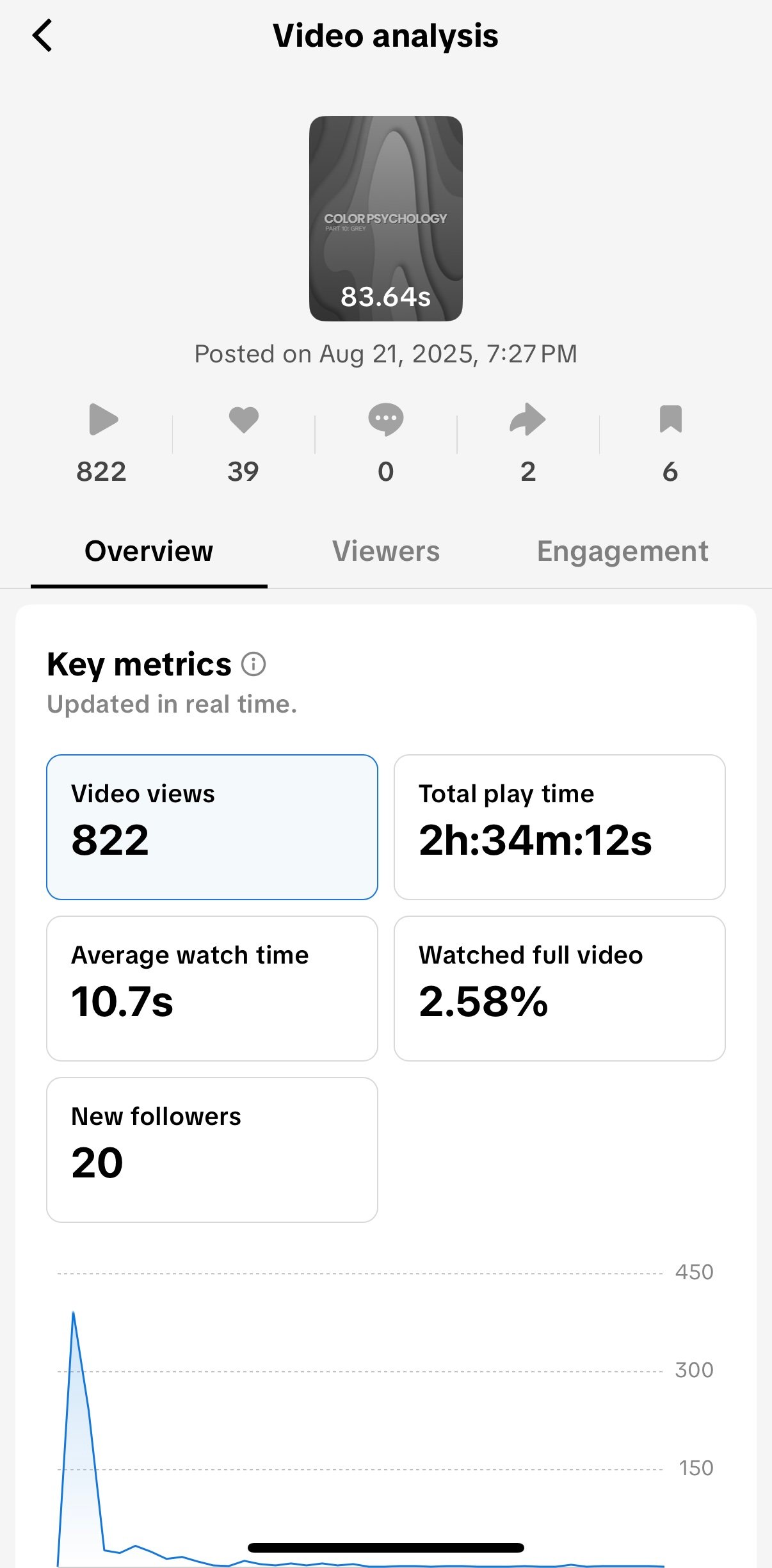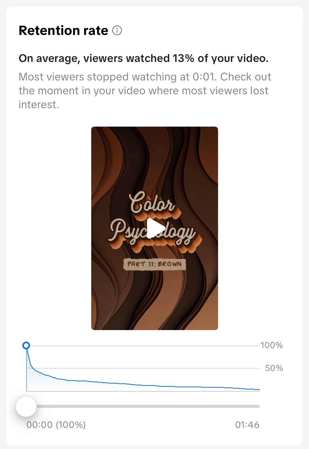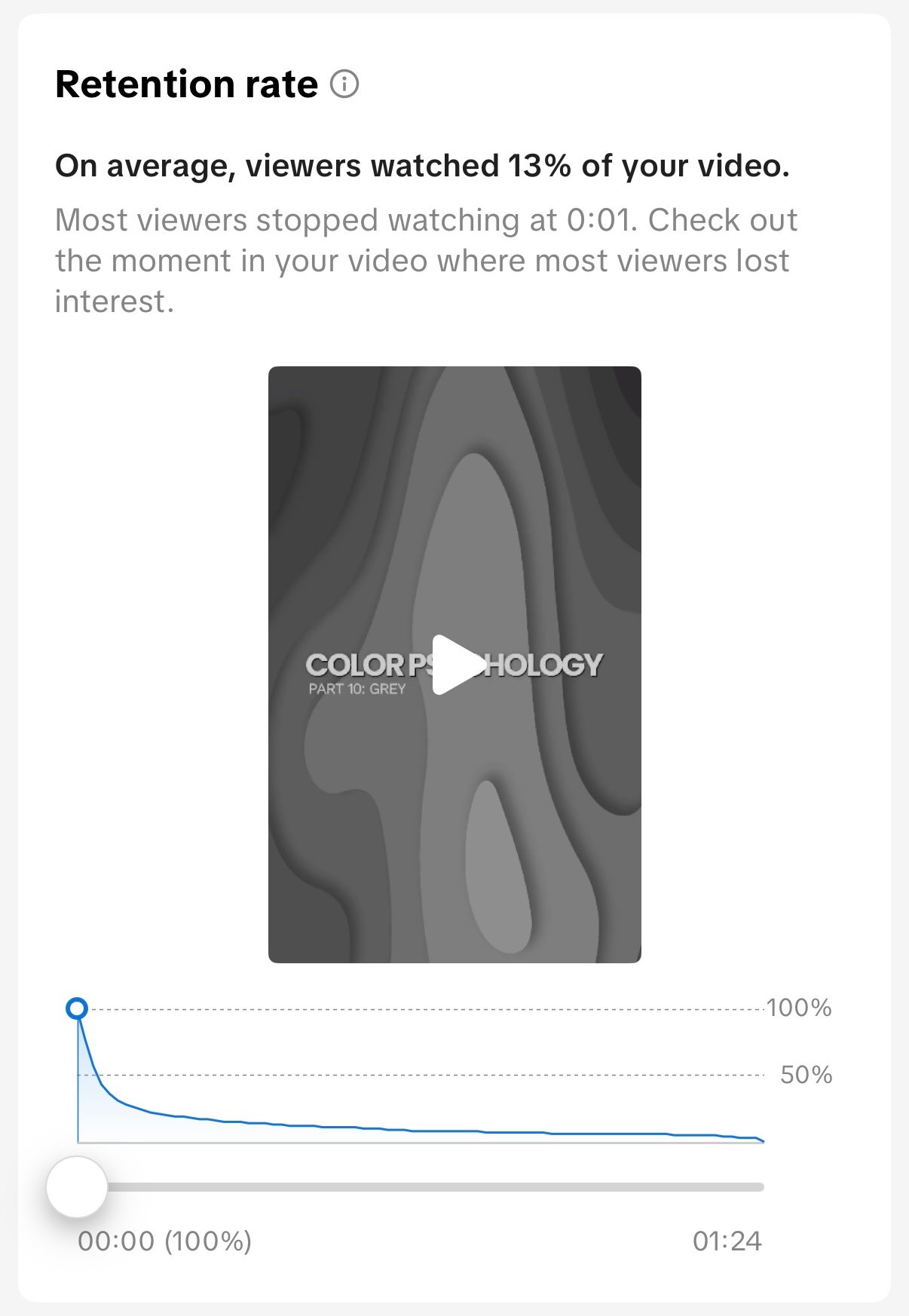 Analysis: I posted my video on the psychology of grey during a peak posting time, but it performed below expectations in terms of reach and engagement. Despite the lower engagement compared to other color videos, it still helped grow my audience, bringing in 20 new followers. In terms of retention, the average watch time was 10.7 seconds, and only 2.58% of viewers watched the video in full, showing that the content may not have been as engaging as my other posts. While the performance wasn’t as strong overall, the fact that it still converted to new followers is a positive takeaway, showing that even lower-performing videos can contribute to steady growth.